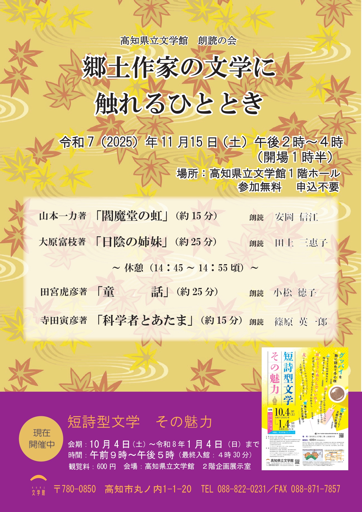 チラシ 202511 完成_page-0001 2025.10.18 一覧へ お知らせ 2026.04.04令和8年度 文学マイスター講座 受講生募集 2026.04.01令和8年度 高校生サポーター(ボランティア)募集のお知らせ 2026.03.30宮尾文学の世界室 展示入替のお知らせ 2026.04.01令和8(2026)年度博物館実習について 2026.03.31「Social Story(ソーシャルストーリー)」ができました ひとことブログ 2026.04.01西沢保彦追悼展・生誕100年記念宮尾登美子展など年度初めの見どころ紹介 2026.03.17トサミズキ 2026.03.08怖い文学はお好き? 2026.02.18それぞれの「人形」たち 2026.02.05春を待つ、2月の木蓮 文学Pickup 2026.01.07『市原麟一郎 土佐民話資料集』刊行! 2021.03.16【作品紹介】中脇初枝著『きみはいい子』 2020.11.19【資料紹介】 上林暁 ノート「ブランデン教授講義録」 2021.03.16【作品紹介】吉田類『酒場詩人の美学』 2021.01.11【作品紹介】有川ひろ著『倒れるときは前のめり』 展示・作家紹介 中山高陽 (1) 宮地佐一郎 (1) 吉田類 (3) 門田隆将 (1) やなせたかし (2) 横田稔 (1) 近現代の詩歌 (1) 現代の作家たち (1) その他(古典) (1) 小砂丘忠義 (1) 松谷みよ子 (1) 辻堂魁 (1) 畠中恵 (1) 近世文人 (8) 宮尾登美子 (10) 寺田寅彦 (14) 高浜虚子 (1) 司馬遼太郎 (1) 大岡昇平 (4) 井伏鱒二 (1) 吉井勇 (1) 浜田波静 (1) 若尾瀾水 (3) 北見志保子 (1) 橋田東声 (1) 島崎曙海 (1) 大江満雄 (1) 上田秋夫 (1) 片山敏彦 (1) 槇村浩 (1) 岡本弥太 (1) 横山充男 (1) 西村繁男 (1) 笹山久三 (1) 田島征彦 (1) 田島征三 (1) 中脇初枝 (10) 藤原緋沙子 (1) 有川ひろ (7) 西澤保彦 (1) 志水辰夫 (2) 嶋岡晨 (1) 山本一力 (2) 坂東眞砂子 (1) 倉橋由美子 (1) 清岡卓行 (2) 大原富枝 (1) 安岡章太郎 (1) 小山いと子 (1) 田宮虎彦 (2) 上林暁 (3) タカクラ・テル (1) 田中英光 (4) 森下雨村 (1) 馬場孤蝶 (2) 浜本浩 (1) 田岡典夫 (1) 田中貢太郎 (1) 大町桂月 (2) 黒岩涙香 (1) 田岡嶺雲 (1) 幸徳秋水 (1) 中江兆民 (1) 坂崎紫瀾 (2) 植木枝盛 (4) 宮崎夢柳 (4) 今村楽 (1) 鹿持雅澄 (1) 五山文学 (3) 紀貫之 (1) 所蔵資料紹介 (1)