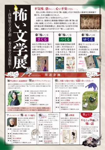 怖い文学展_チラシ_裏 2025.11.26 一覧へ お知らせ 2026.02.03【お知らせ】2月25~26日こどものぶんがく室・授乳室は利用できません 2026.01.292月のおはなしキャラバン 2026.01.07『市原麟一郎 土佐民話資料集』刊行! 2025.12.201月のおはなしキャラバン 2025.10.29お城下文化の日(令和7年11月9日(日)) ひとことブログ 2026.02.05春を待つ、2月の木蓮 2026.01.21不思議な体験談 2026.01.08怖い文学展、準備中です! 2026.01.01新年ごあいさつ 2025.12.10師走を迎えて 文学Pickup 2026.01.07『市原麟一郎 土佐民話資料集』刊行! 2021.03.16【作品紹介】中脇初枝著『きみはいい子』 2020.11.19【資料紹介】 上林暁 ノート「ブランデン教授講義録」 2021.03.16【作品紹介】吉田類『酒場詩人の美学』 2021.01.11【作品紹介】有川ひろ著『倒れるときは前のめり』 展示・作家紹介 中山高陽 (1) 宮地佐一郎 (1) 吉田類 (3) 門田隆将 (1) やなせたかし (2) 横田稔 (1) 近現代の詩歌 (1) 現代の作家たち (1) その他(古典) (1) 小砂丘忠義 (1) 松谷みよ子 (1) 辻堂魁 (1) 畠中恵 (1) 近世文人 (8) 宮尾登美子 (9) 寺田寅彦 (13) 高浜虚子 (1) 司馬遼太郎 (1) 大岡昇平 (4) 井伏鱒二 (1) 吉井勇 (1) 浜田波静 (1) 若尾瀾水 (3) 北見志保子 (1) 橋田東声 (1) 島崎曙海 (1) 大江満雄 (1) 上田秋夫 (1) 片山敏彦 (1) 槇村浩 (1) 岡本弥太 (1) 横山充男 (1) 西村繁男 (1) 笹山久三 (1) 田島征彦 (1) 田島征三 (1) 中脇初枝 (10) 藤原緋沙子 (1) 有川ひろ (7) 西澤保彦 (1) 志水辰夫 (2) 嶋岡晨 (1) 山本一力 (2) 坂東眞砂子 (1) 倉橋由美子 (1) 清岡卓行 (2) 大原富枝 (1) 安岡章太郎 (1) 小山いと子 (1) 田宮虎彦 (2) 上林暁 (3) タカクラ・テル (1) 田中英光 (4) 森下雨村 (1) 馬場孤蝶 (2) 浜本浩 (1) 田岡典夫 (1) 田中貢太郎 (1) 大町桂月 (2) 黒岩涙香 (1) 田岡嶺雲 (1) 幸徳秋水 (1) 中江兆民 (1) 坂崎紫瀾 (2) 植木枝盛 (4) 宮崎夢柳 (4) 今村楽 (1) 鹿持雅澄 (1) 五山文学 (3) 紀貫之 (1) 所蔵資料紹介 (1)